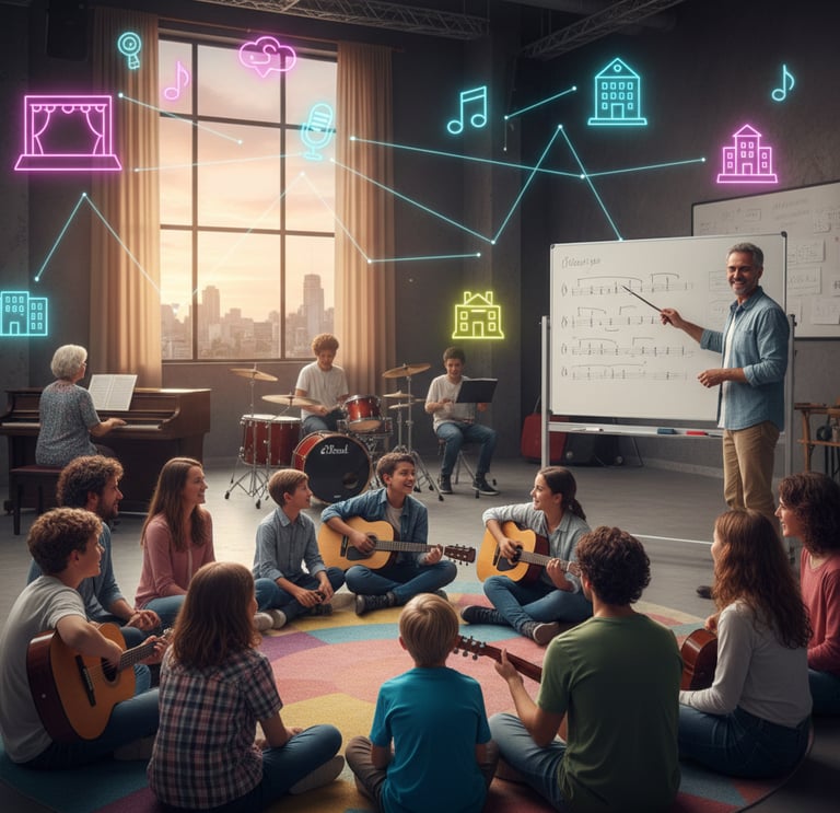 Oficinas e formações em música, violão e trilha sonora para escolas, ONGs e projetos culturais.