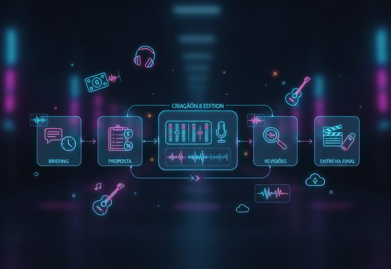 O prazo depende da complexidade, mas em geral vinhetas saem mais rápido, spots levam alguns dias entre roteiro e gravação, e jingles exigem mais tempo por envolver composição, arranjo e gravação completa.
